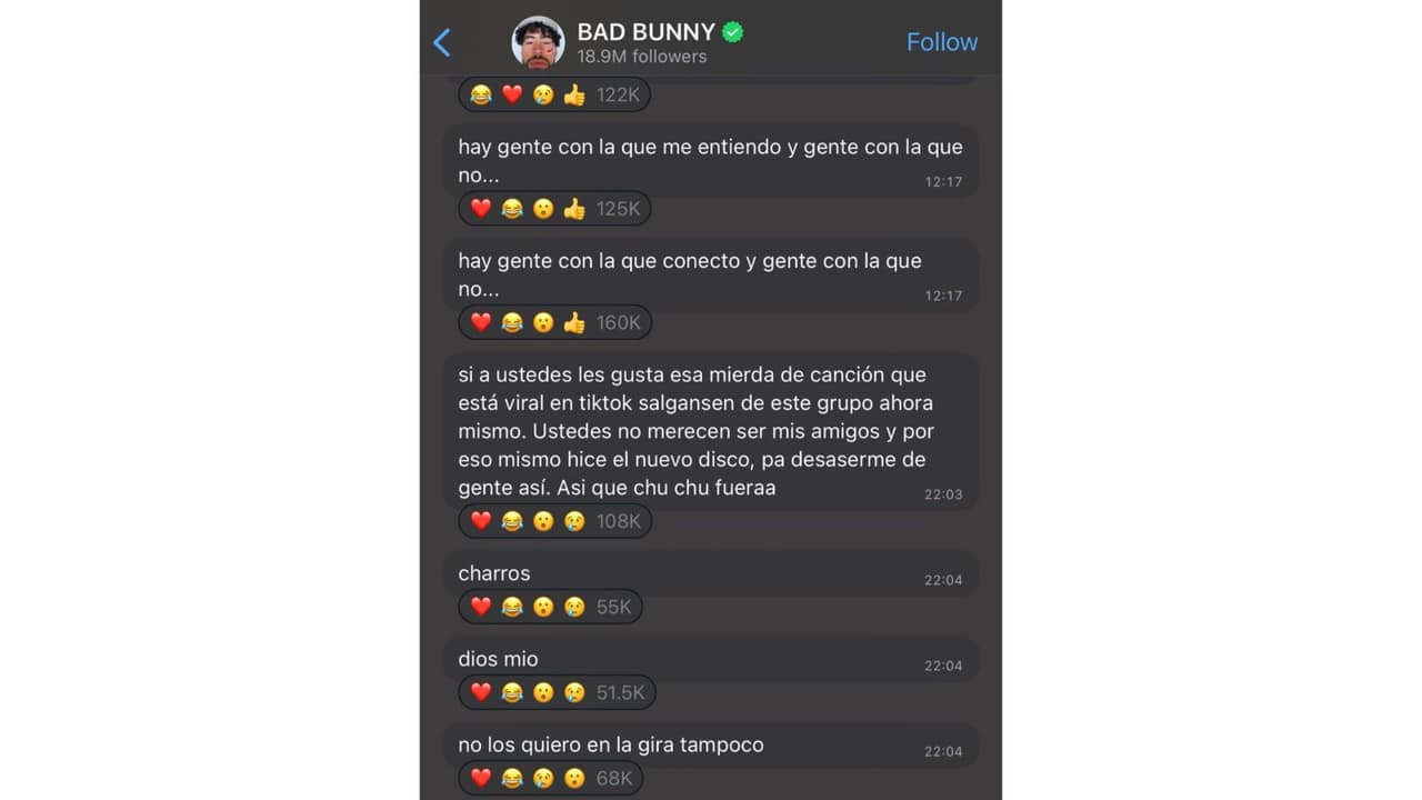 "Si a ustedes les gusta esa mierda de canción que está viral en TikTok salgan de este grupo ahora mismo. Ustedes no merecen ser mis amigos y por eso mismo hice el nuevo disco, para deshacerme de gente así. Chu chu fueraa. Charros. Dios mio. No los quiero en la gira tampoco", concluye.