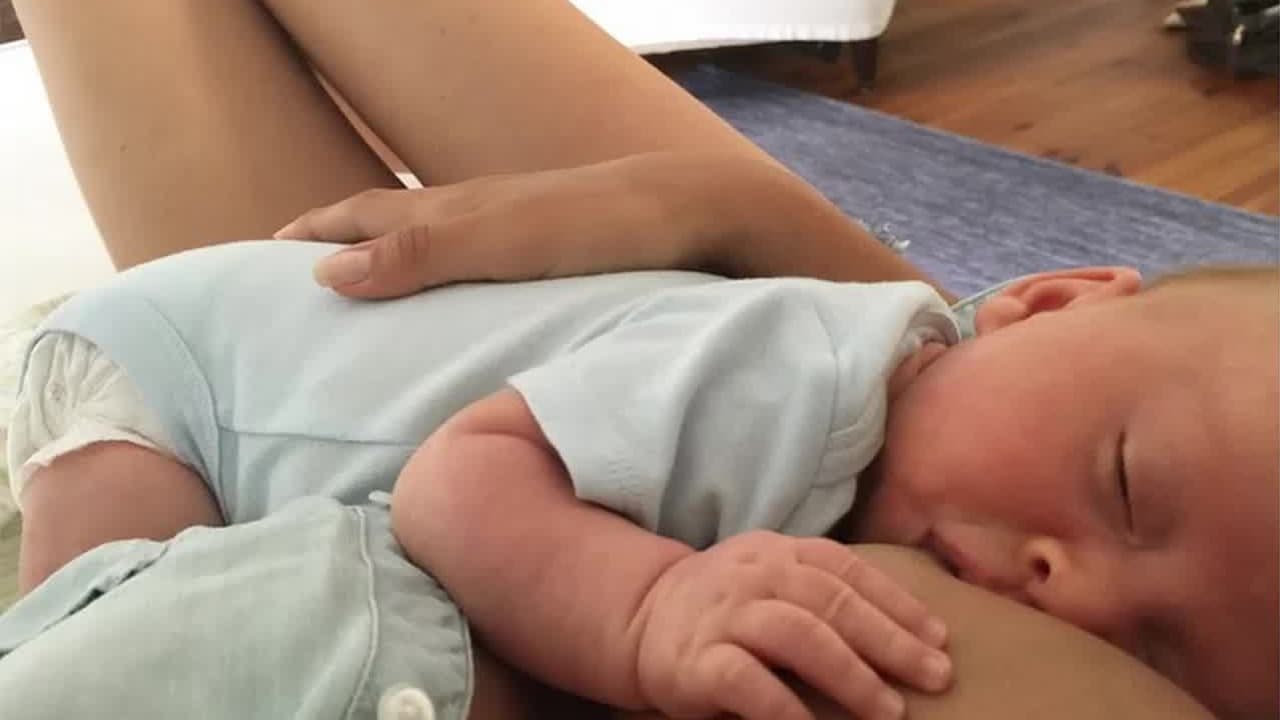 Hilaria Baldwin comparte una foto nueva en Instagram mientras lactaba a su bebe Rafael de casi dos meses de nacido.