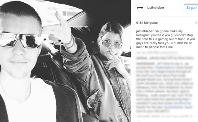 "Voy a hacer privado mi Instagram si ustedes no paran el odio que se está saliendo de control, si son realmente fans no serían tan malos con la gente que me agraden", escribió Bieber.
