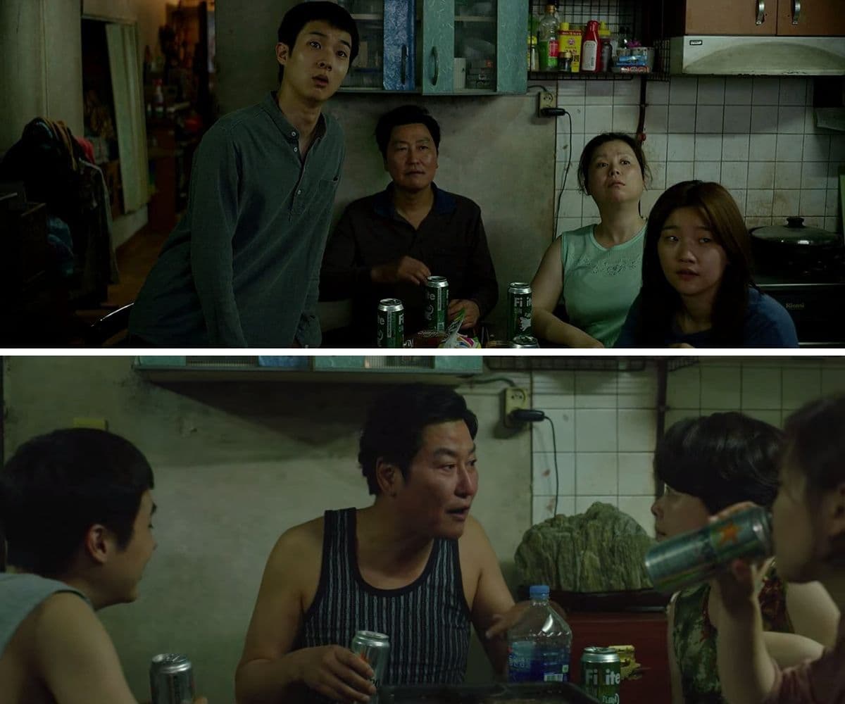Al inicio del filme, los Kim beben cerveza FiLite, la cual es una de las cervezas más baratas de Corea. Una vez que consiguen empleo en la casa de los Park, pueden darse el pequeño gusto de disfrutar una Sapporo, la cual es una cerveza no sólo premium sino también importada de Japón.