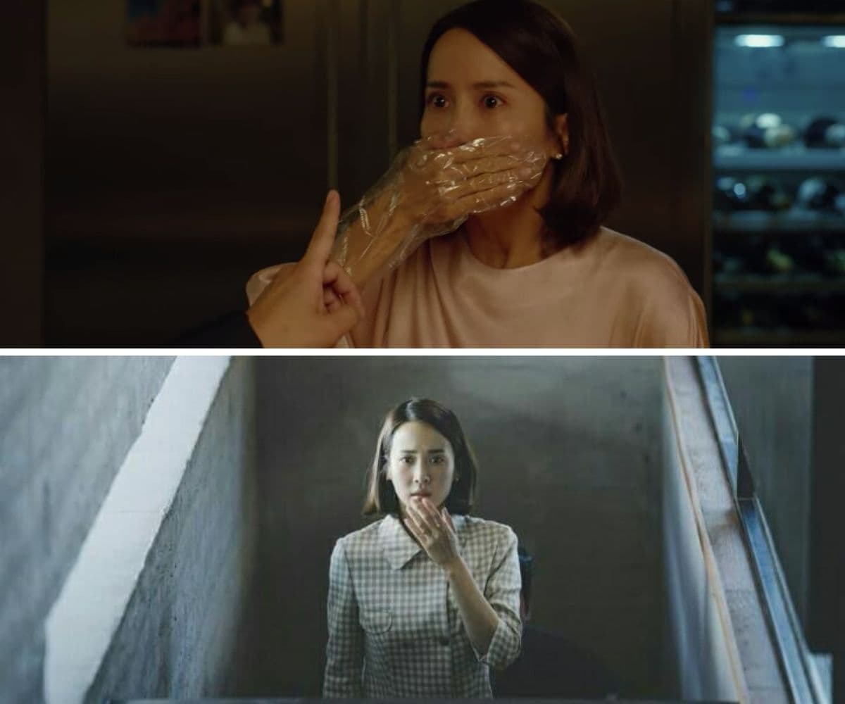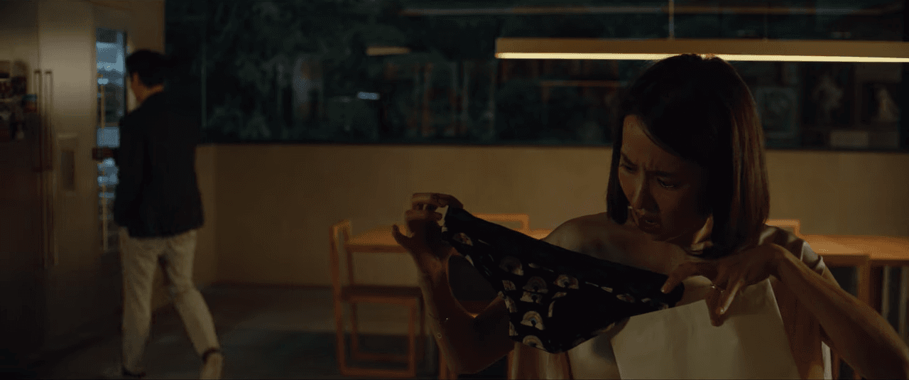 El momento de la revelación de la ropa interior del "chofer" –que en realidad es de Ki-jung– tiene varios instantes en donde la sorpresa de la Sra. Park la traiciona constantemente.