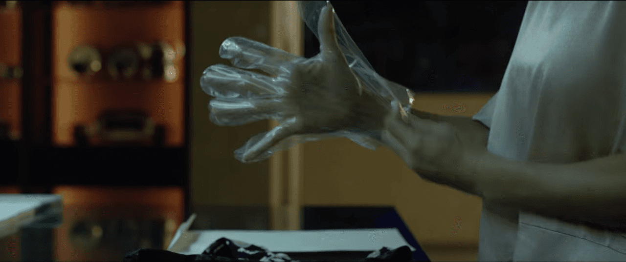 En seguida, se da cuenta de lo antihigiénico que es lo que acaba de hacer y decide cubrir sus manos, o por lo menos la mano derecha con un guante.