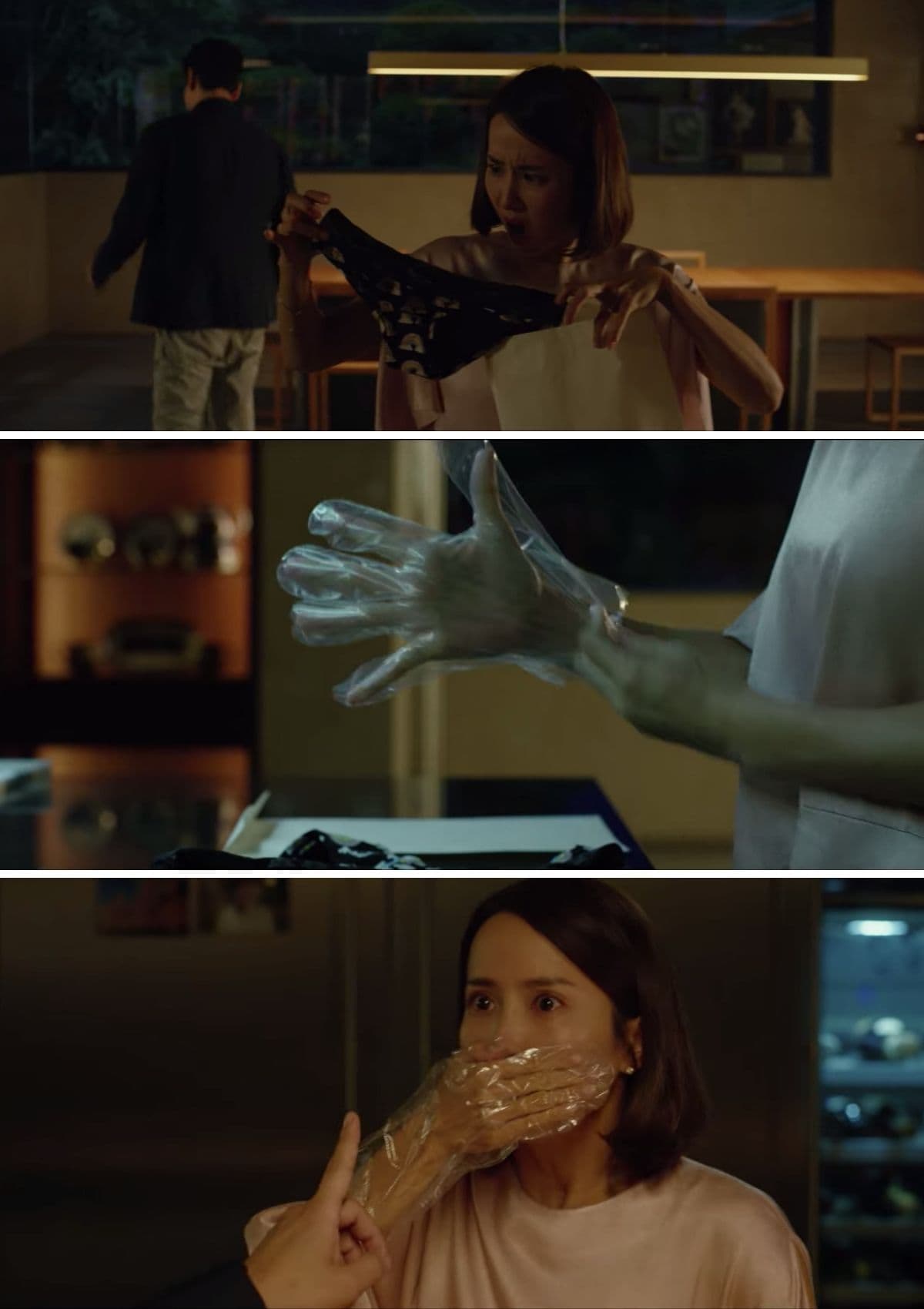 La insinuación de la clase de mujer a la que pertenece esa ropa interior de su esposo hace que la Sra. Park experimente un episodio de gran sorpresa y obvio tenía que ponerse la mano con el guante con el que ya tocó los calzones en la boca.