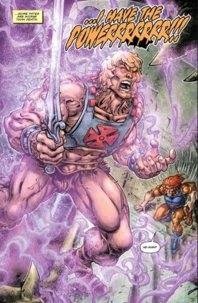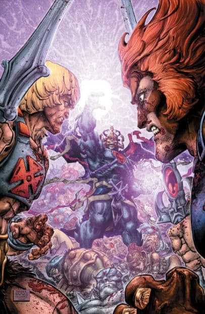 Por fortuna, León-O y He-Man unen fuerzas para combatirlo, pero no sin antes tener una de las peleas más épicas en la historia de ambas franquicias, que resulta en una victoria para el ThunderCat, bajo circunstancias que no apoyaron al príncipe Adam.