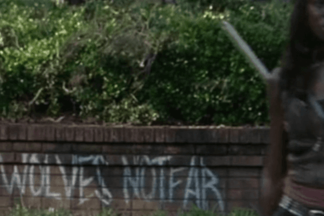 Mientras el grupo pasa por la calle podemos ver por unos segundos un muro que dice “ wolves not far” (Los lobos no están lejos). Al mirar el vecindario está claro que fue atacado por fuerzas exteriores desconocidas, ¿podrían haber atacado esos lobos? ¿Son lobos literalmente o son algún grupo problemático?