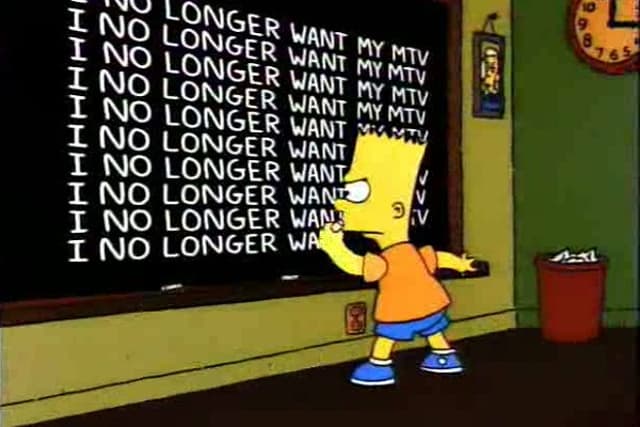 En 1997 podía leerse en la pizarra de Bart la frase “I not longer want my MTV” (Ya no quiero mi MTV). Lo interesante es que en esa época MTV todavía tenía videos musicales y pocos reality shows. Años más tarde, MTV se convirtió en algo que otras generaciones no reconocen, y por lo cual pueden sentirse identificados con la frase.