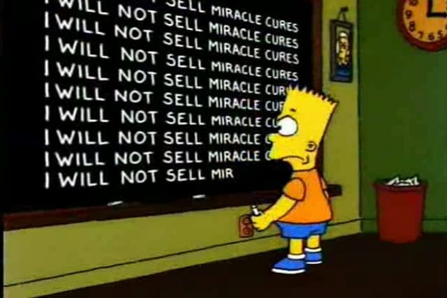 Durante “The Front”, en 1993, Bart escribió “I will not sell miracle cures” (No venderé curas milagrosas). Fue una casualidad que justo en los 90 se expandiera un nuevo mercado de medicamentos que prometían curar de todo. Cientos de libros sobre sustancias curativas se vendieron y se abrió un espacio para las curas milagrosas.