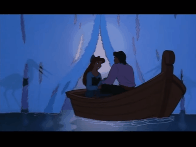 Se trata de una de las escenas más románticas de la película, cuando los amigos de Ariel tratan de ayudarla para que se bese con el príncipe Erik. Mientras la pareja está en la balsa podemos ver que ella está peinada con una media coleta, pero cuando sus sombras se reflejan en el agua, parece que la chica tiene una cola de caballo.