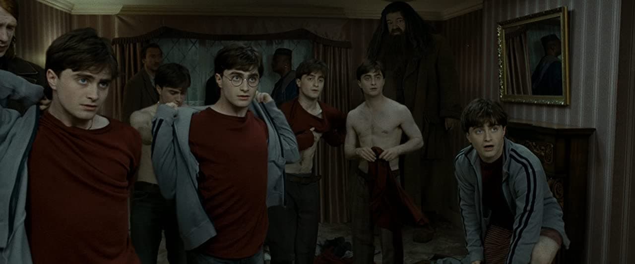 Hay 7 versiones de Harry, pero la original vuela en la motocicleta de Hagrid. Durante el viaje, Hedwig muere, George pierde una oreja y Alastor Moody es asesinado.