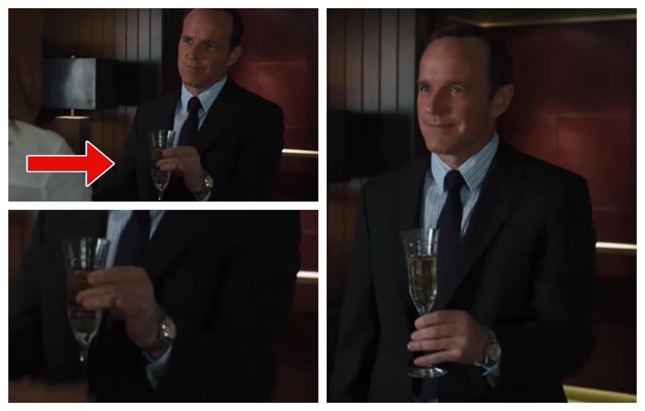 Hay una secuencia en la que Tony Stark está reunido con Pepper Potts y Phil. Pepper le da una copa de vino y Phil la sostiene de la parte de arriba. Sin embargo, cuando cambia la toma ya sostiene la copa por debajo de la misma. ¡Un movimiento demasiado rápido para hacerlo en un segundo entre cambio de tomas!