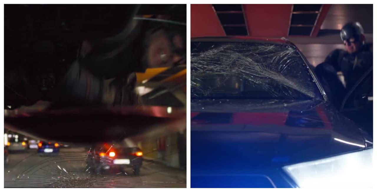 El Capitán América se encuentra persiguiendo a los maleantes y llega un momento en el que (con su escudo) logra aterrizar en un auto en movimiento. Al principio de observa que el golpe impacta muy levemente el vidrio, pero cuando cambia la toma, el parabrisas está completamente deshecho. ¿Será un efecto tardío del golpe?