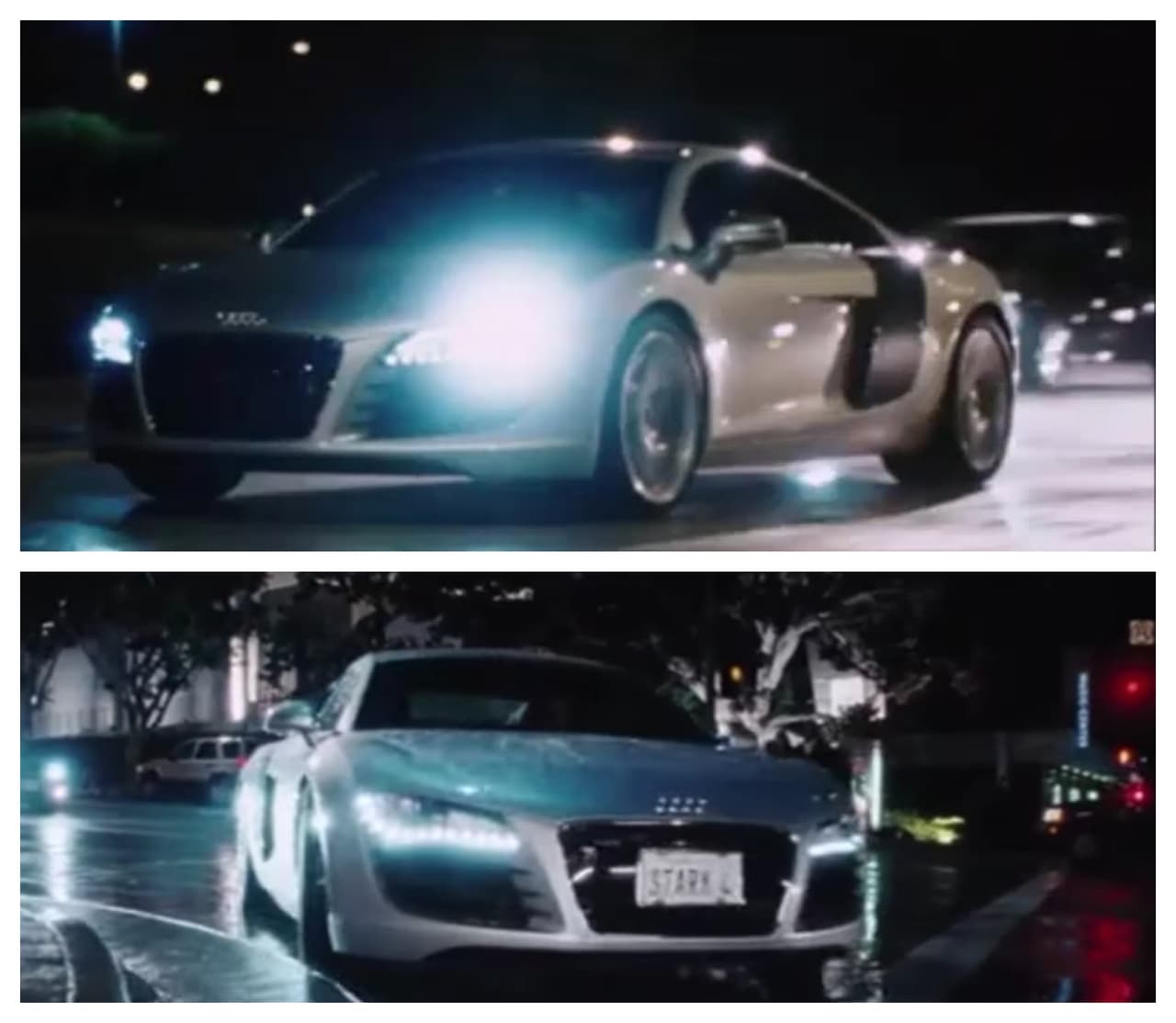 El segundo sucede en el momento que Tony Stark se pavonea en su Audi. Parece una secuencia en la que su auto no tiene placas, pero cuando llega a un evento ya tiene las placas y dicen «Stark».