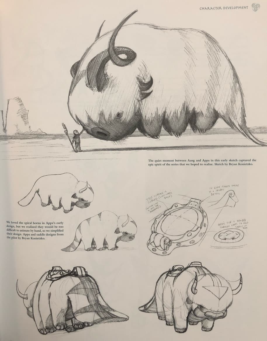Después, como puede verse en la página oficial de Tumblr de Bryan Konietzko, los cuernos de Appa eran retorcidos, y el bisonte era un poco más grande y pachoncito.