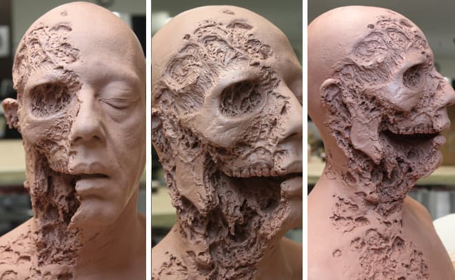 Así, se creó una escultura 3D de la cabeza del actor con las partes de su rostro y su cabeza que debían lucir destruidas, y otra máscara prostética que utilizaría el actor, con la añadidura de efectos digitales para ver realmente dentro de su cabeza.
