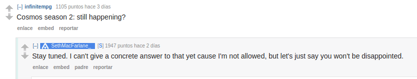 No obstante, todavía no es seguro, pero la respuesta de MacFarlane es bastante alentadora y no podemos dejar de pensar en nuevos episodios de Cosmos, tan divertidos como didácticos.