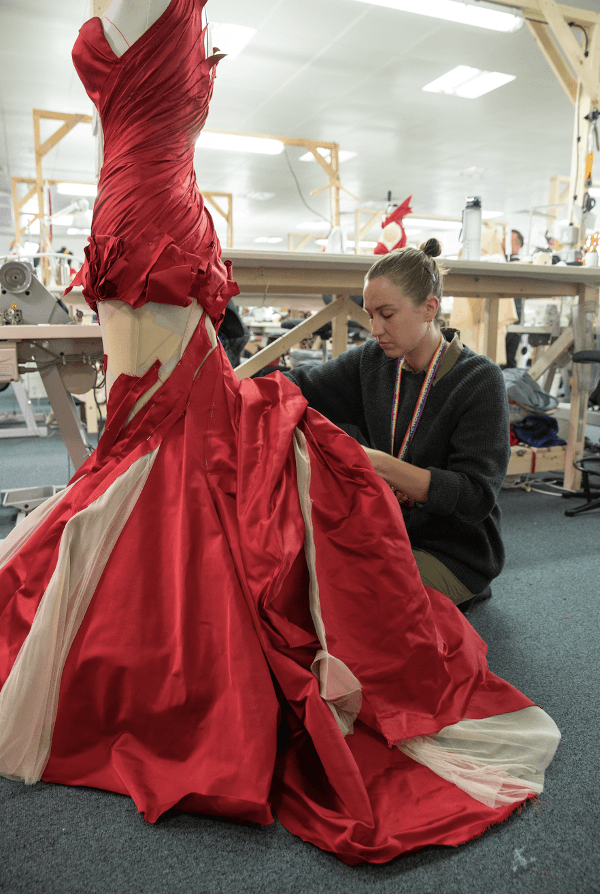 La entrada de Cruella al baile Blanco y Negro es tan impactante gracias a su espectacular vestido rojo que no sólo contrasta de inmediato con el blanco y negro del evento, sino que deslumbra con los miles de pétalos de la falda. En total, 5060 pétalos de organza fueron cosidos a mano para conseguir esta enorme falda.
