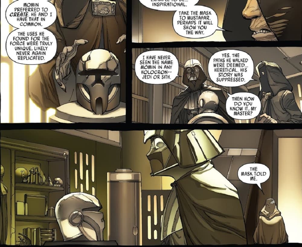 De acuerdo con los cómics, Darth Vader viaja a Mustafar, el planeta donde perdió contra Obi Wan Kenobi, con el objetivo de construir un castillo donde pudiera revivir a Padme por órdenes del emperador Palpatine. Él le da un objeto para su viaje, el casco de su maestro, Darth Momin.