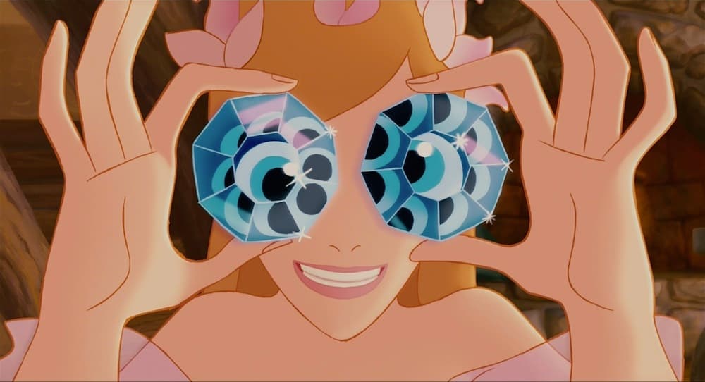 Giselle usa diamantes para poner ojos a la estatua, y mira a través de ellos igual que Tontín en la mina de Blancanieves.