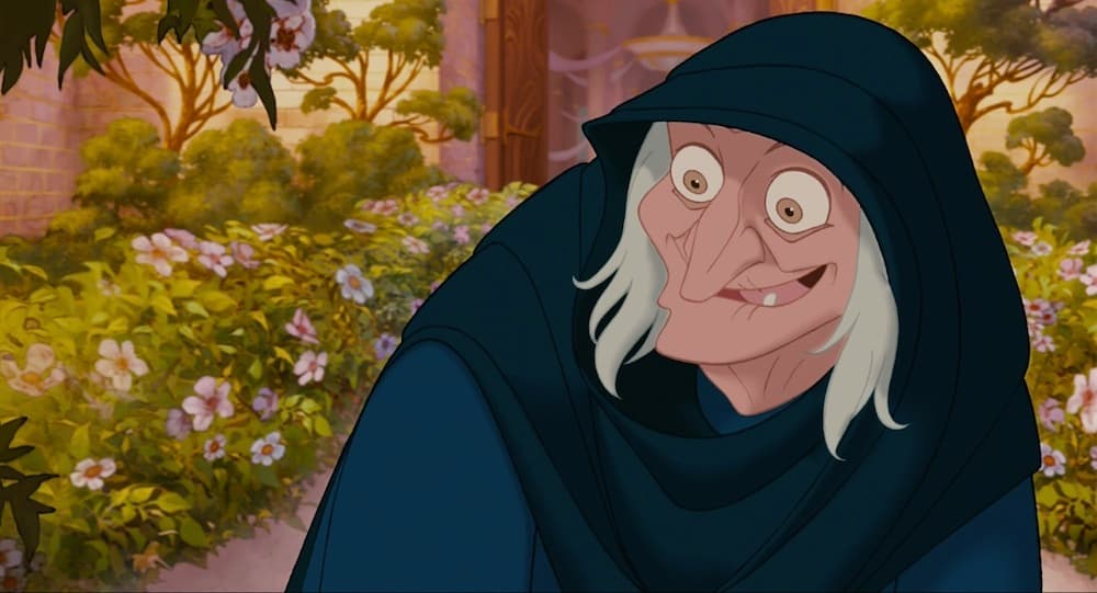 Cuando se convierte en una anciana, ¿no se parece a alguien? Si, a la bruja de Blancanieves.