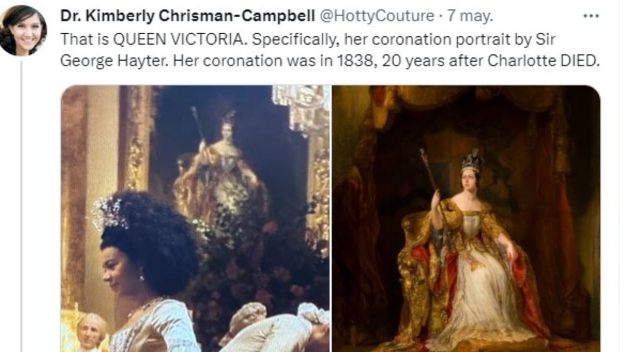 "Estos dos son adorables, pero los retratos de 'Queen Charlotte' me están matando ¡Ninguna de esas personas ni siquiera nació en 1761", fue su primer reacción.