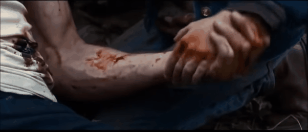 Está lleno de sangre a causa de las heridas y sí, su corazón está en sus manos.