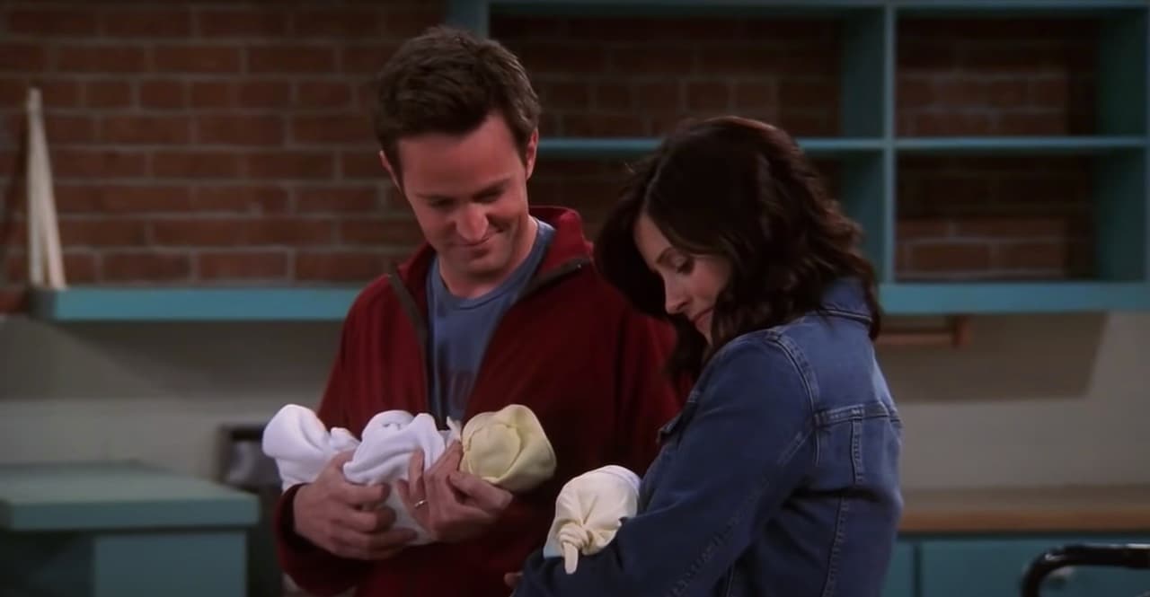 Al final de la décima temporada, Courtney Cox aparece en pantalla con ropa holgada y tomas cerradas porque la producción debía ocultar su embarazo, mientras que Monica y Chandler buscaban desesperadamente tener un hijo.