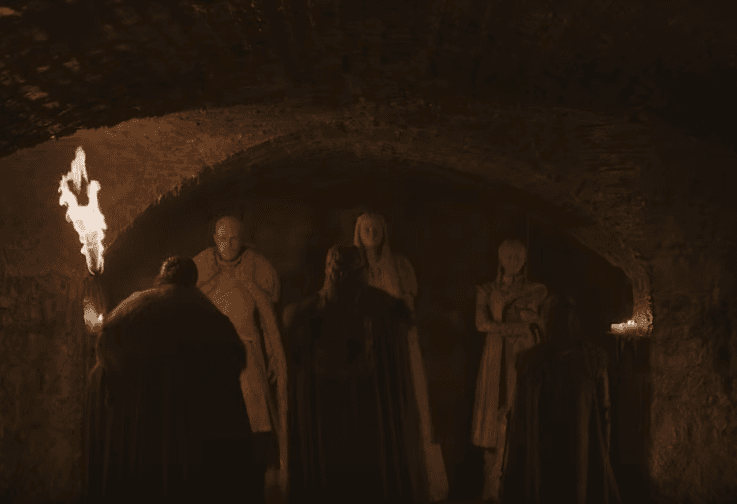 «Los muertos ya están aquí», le dice Daenerys a Jon, con cara de preocupación. Teniendo en cuenta que no es ninguna novedad, ya los vimos en el final del segundo episodio parados frente a Winterfell, puede que la Reina se esté refiriendo a otros muertos: a los de las criptas.