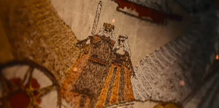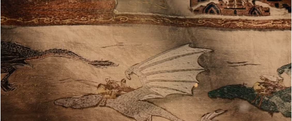 En una escena se puede ver cómo los hilos forman un bordado donde resaltan un castillo en llamas, hombres muertos a su alrededor y una enorme mancha roja que refleja la masacre. Esta representa la quema que realizó Aegon el Conquistador en Harrenhal, una de las edificaciones más grandes de los Siete Reinos, para demostrar su poder.