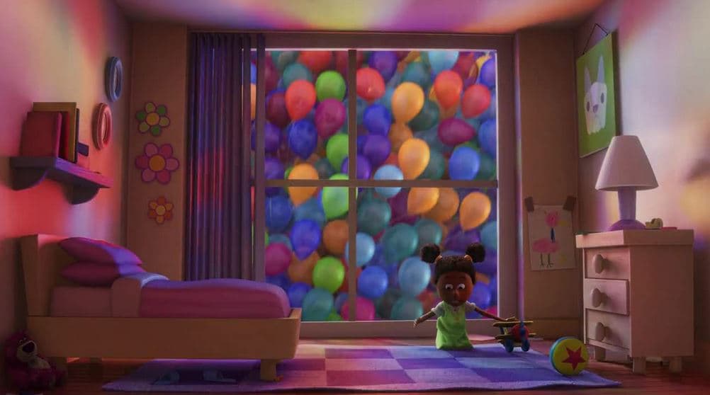 Un ejemplo de esto es cuando Carl logra alzar su casa con globos y se ve cómo pasa cerca de un edificio de departamentos. En uno de ellos, una niña está jugando con la famosa pelota de esta casa productora.