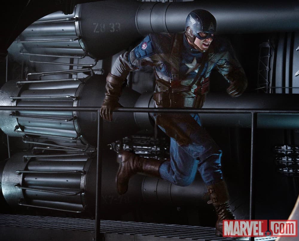 De todas maneras, en la película después Rogers ingresa al museo Smithsonian y roba de allí (para lamento del guardia de seguridad interpretado por Stan Lee) un traje que es una variación del utilizado durante la Segunda Guerra Mundial.
