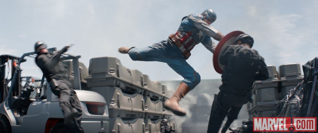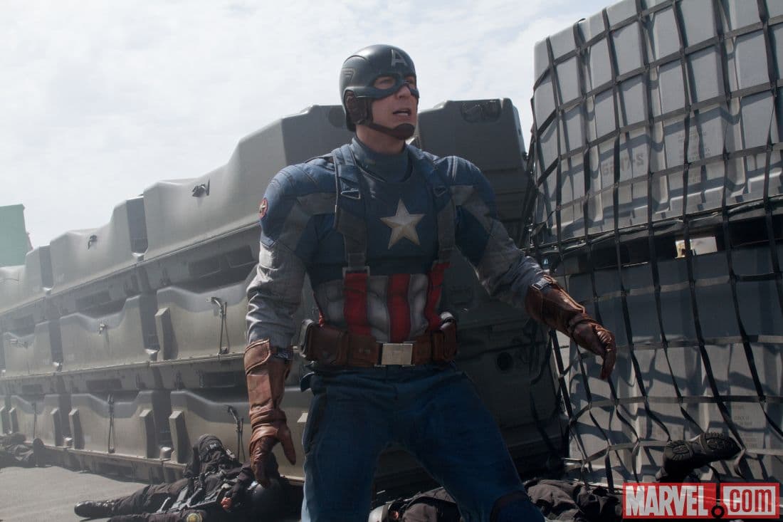 Esta versión parece ser similar a la anterior de S.H.I.E.L.D para misiones secretas, pero ahora con los más tradicionales colores patriotas del Cap. Se puede suponer que esta versión del traje fue diseñada por Tony Stark, ya que algo así dice él mismo en la película. Los guantes hyan sido modificados para que el escudo regrese a Steve durante las batallas.