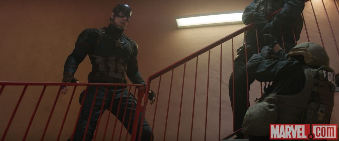 El nuevo traje del Cap para su segunda película está modificado para ser utilizado en misiones secretas de S.H.I.E.L.D. y se ajusta a la atmósfera de espionaje del film. Tiene tonos más oscuros, luce más utilitario y le permite una mayor movilidad. Además, su escudo se adhiere a su espalda magnéticamente.