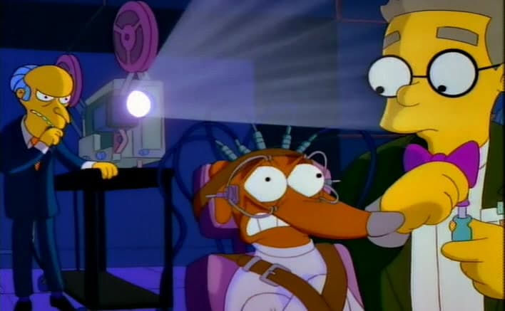 Terapia a la inversa . Los Simpson es un programa lleno de referencias a la cultura pop. En el capítulo «Nuestro mejor amigo», el señor Burns secuestra a Ayudante de Santa para hacerlo un perro de caza. Para lograrlo, emplea la técnica de Ludovico, transformándolo en un animal despiadado.