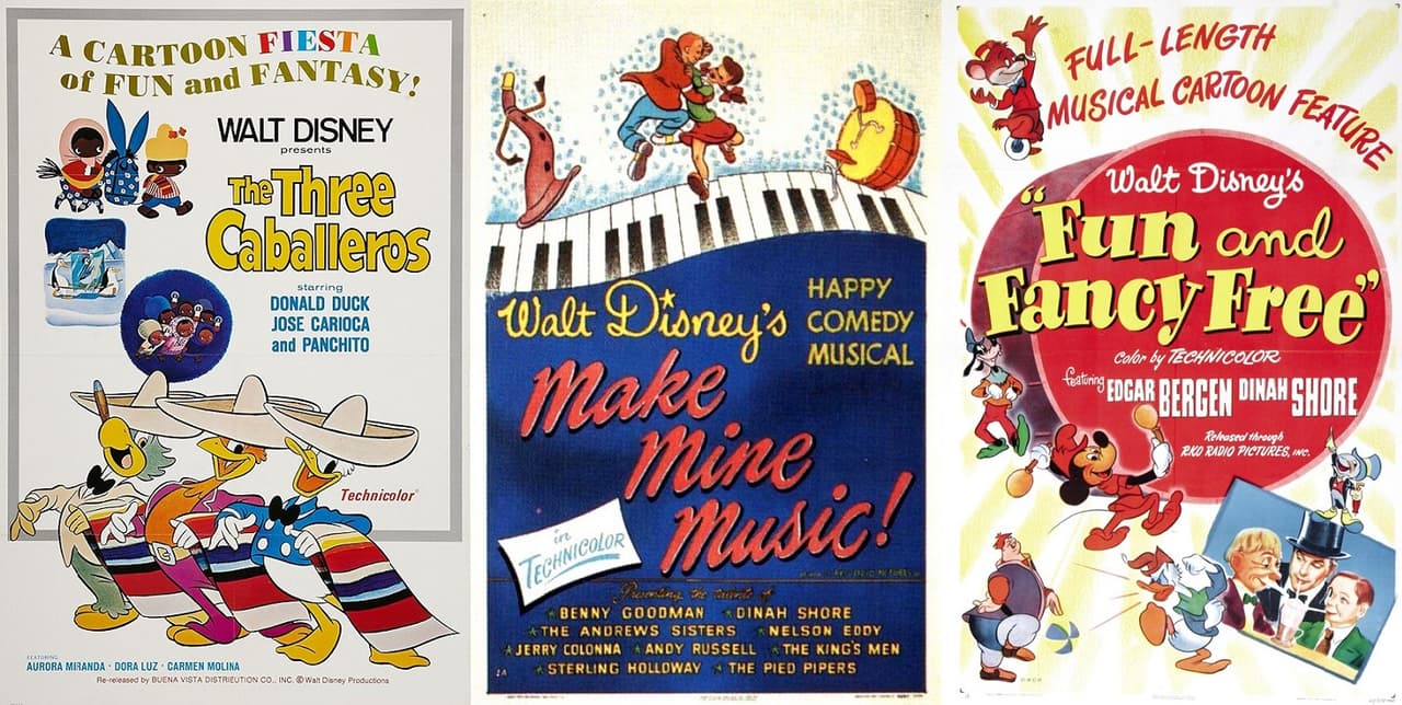 - Make Mine Music (1946). Es una película antológica creada con 10 diferentes segmentos animados y musicales reciclados o nunca antes presentados como cortometrajes.
