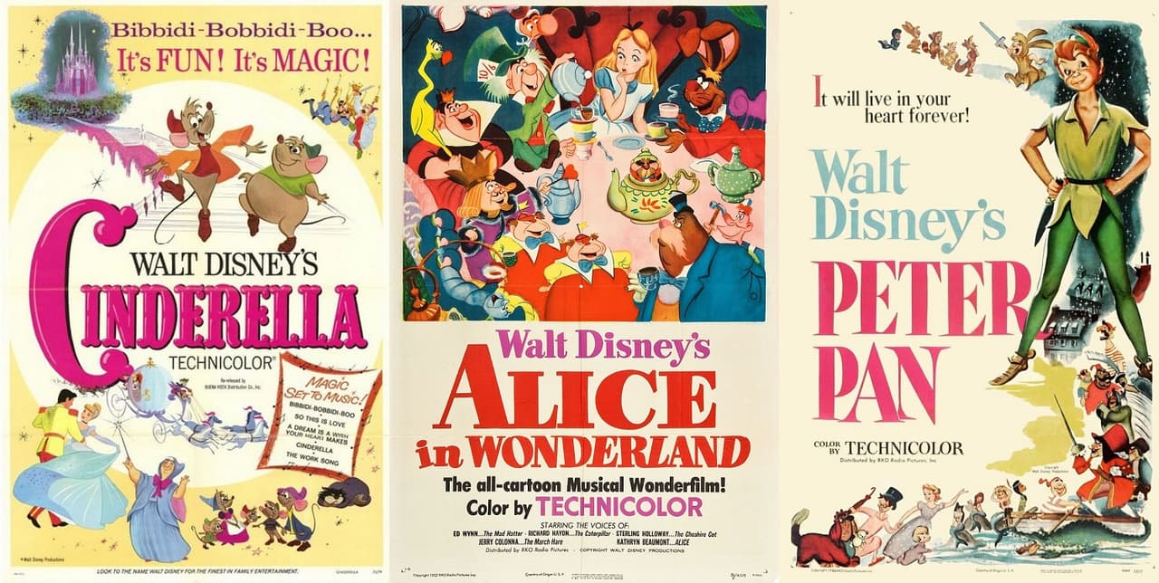 - Cinderella (1950). La primera en presentar fondos ricos en detalles precisos, además de incluir un estudio anatómico que vuelve muy realistas los movimientos de sus personajes (los humanos).