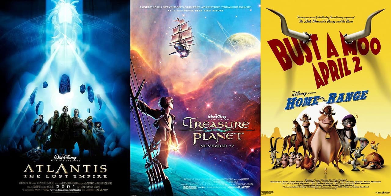 - Home on the Range (2004). Debido a las múltiples reescrituras que sufrió, se debió abaratar costos en los fondos, que son bastante pobres si consideramos que se trata de una obra de Disney.