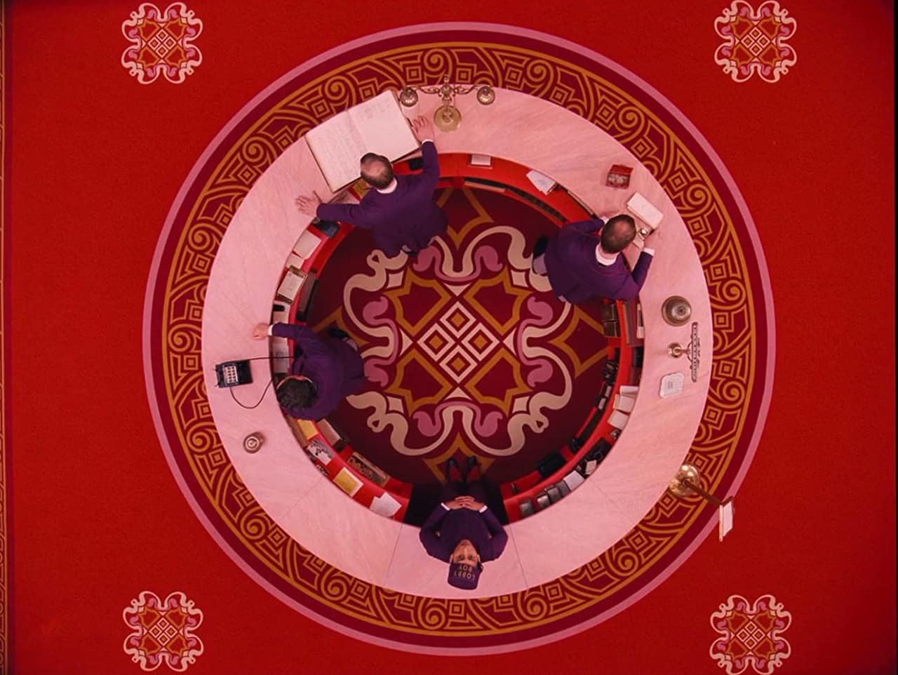 La toma cenital de la recepción del Gran Hotel Budapest es una de las más bonitas gracias al increíble contraste de los tonos rosas y morados contra el rojo de la alfombra.