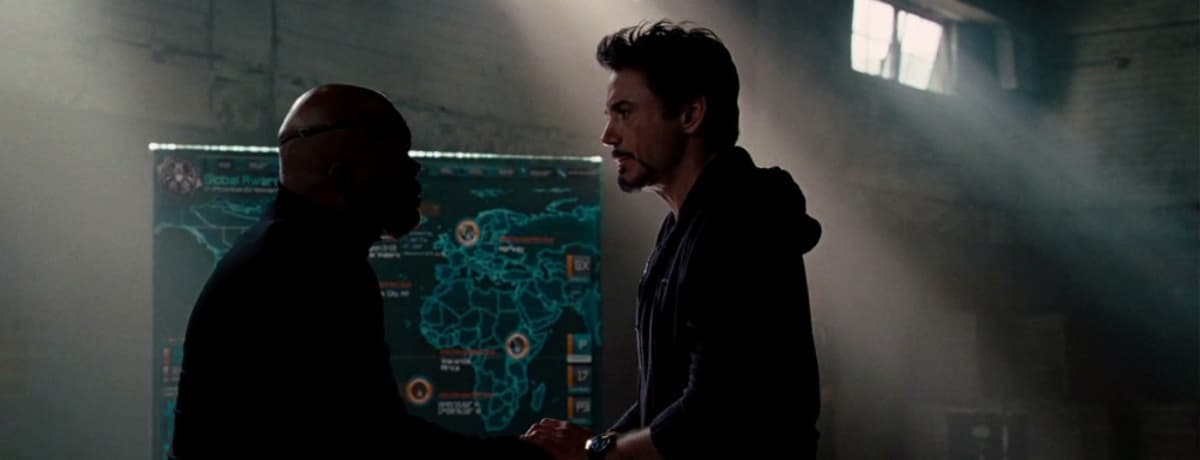 Cerca del final de Iron Man, Nick Fury le dice a Tony que no tiene lo necesario para ser un Avenger, y en fondo podemos ver mapas de SHIELD con áreas de interés resaltadas.
