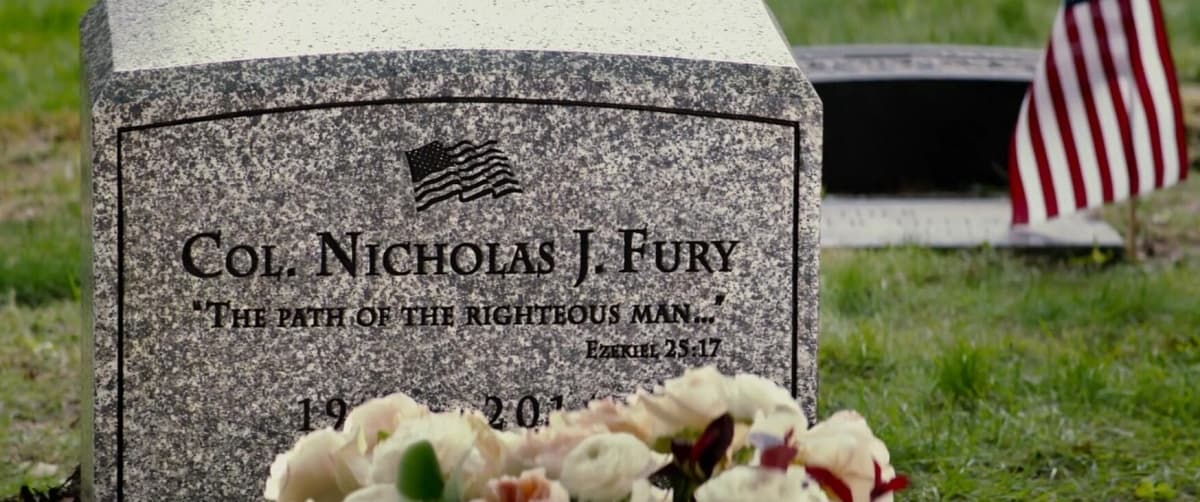 Al parecer, lo único que Nick Fury ama más que los secretos es fingir su propia muerte, a tal nivel que en Capitán América: El Soldado de Invierno, vemos a Nick visitando su propia tumba, la cual tiene una inscripción muy interesante.