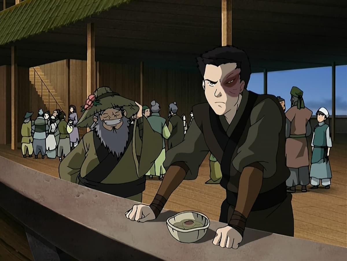 Zuko se enoja y lo llama viejo tonto, pero el chico claramente está en conflicto consigo mismo, porque, para él, Iroh es más su padre que el propio Señor del Fuego.