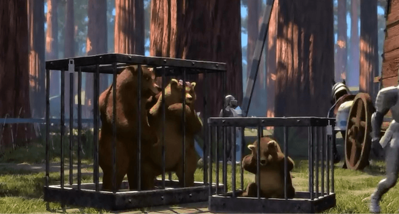 Los integrantes del cuento 'Ricitos de oro y los tres osos' están en jaulas separadas, pero es posible verlos a los tres. Ellos están listos para ser trasladados y aunque la escena es corta y su destino incierto, observamos al pequeño osito llorando.