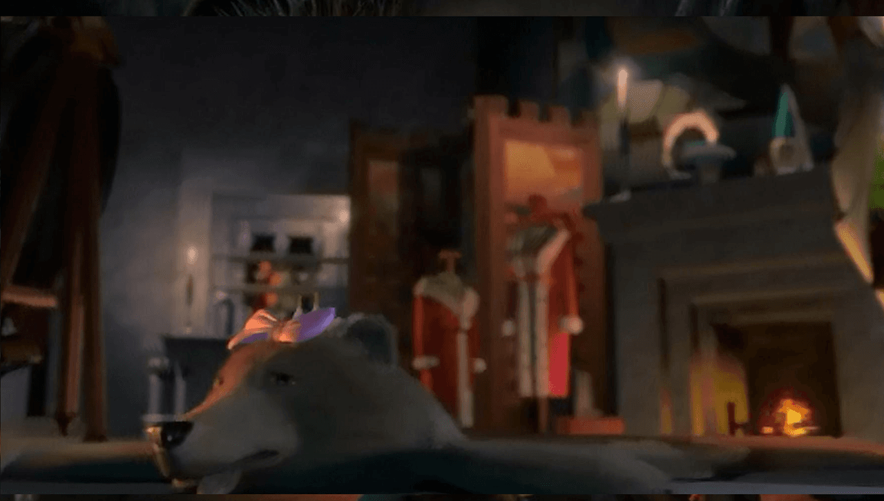 Mientras Lord Farquaad muestra un inapropiado comportamiento al ver a su futura esposa en el espejo mágico, somos testigos de su afición por las pieles... tristemente su colección ahora incluye a Mamá Oso, con moño y todo. Seguro en cuanto la vio encargó a sus hombres desollarla para hacer un "bonito" tapete.