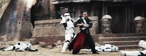 Chirrut Îmwe (interpretado por Donnie Yen), un guerrero espiritual totalmente ciego que venera la Fuerza y domina las artes marciales. Aunque no estamos frente a un Jedi, es el personaje que nos conecta a la Fuerza de forma más sincera y coherente. Personalmente, mi favorito (a pesar de los estereotipos).