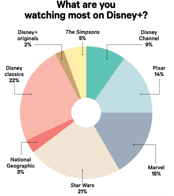 Los demás productos que consumen las personas en Disney+ es Pixar con 14%, le siguió con 9% todo lo relacionado con Disney Channel. Los últimos dos lugares, con 3% y 2%, son programas de National Geographic y originales de Disney+, respectivamente.