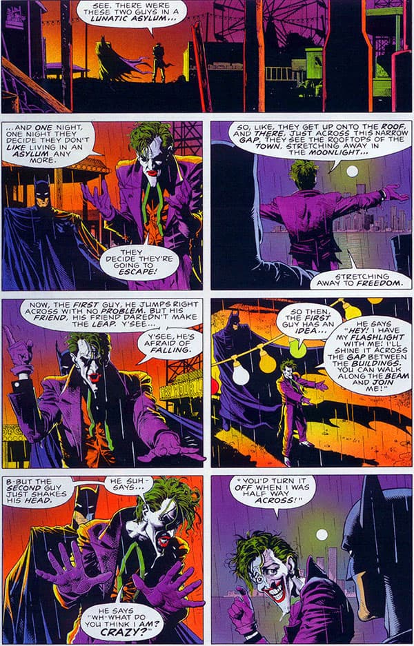 Publicado originalmente en 1988, The Killing Joke ofrece una visión sobre el origen del Joker como un comediante fracasado, que se ve obligado por las circunstancias a convertirse en criminal. Pero lo más impactante del cómic seguramente sea el momento en que el Joker dispara a Barbara Gordon dejándola paralítica.