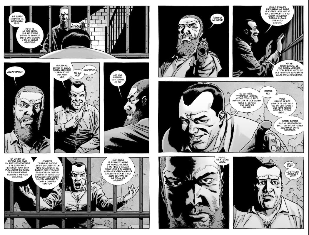 Una de las conversaciones más interesantes de Rick y Negan en el cómic fue recreada en la serie, pero con Michonne del otro lado de los barrotes de la prisión del exvillano. Es la primera vez que lo vemos luego de su escape perfecto que terminó en un regreso con la cabeza gacha.