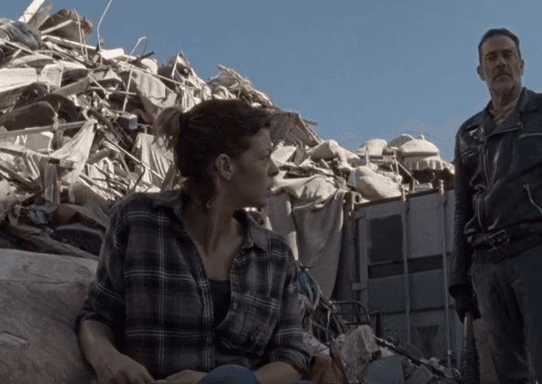 Primero vemos a Jadis mostrándonos su capacidad de hacerse pasar por cadáver, y luego conocemos un nuevo escondite dentro del basurero: una habitación sorprendentemente limpia y ordenada en donde se oculta. Posteriormente, Jadis deja salir a Negan de un contenedor, atado con alambres, y lo amenaza con un caminante, pero sucede lo inesperado (y más bizarro del episodio).