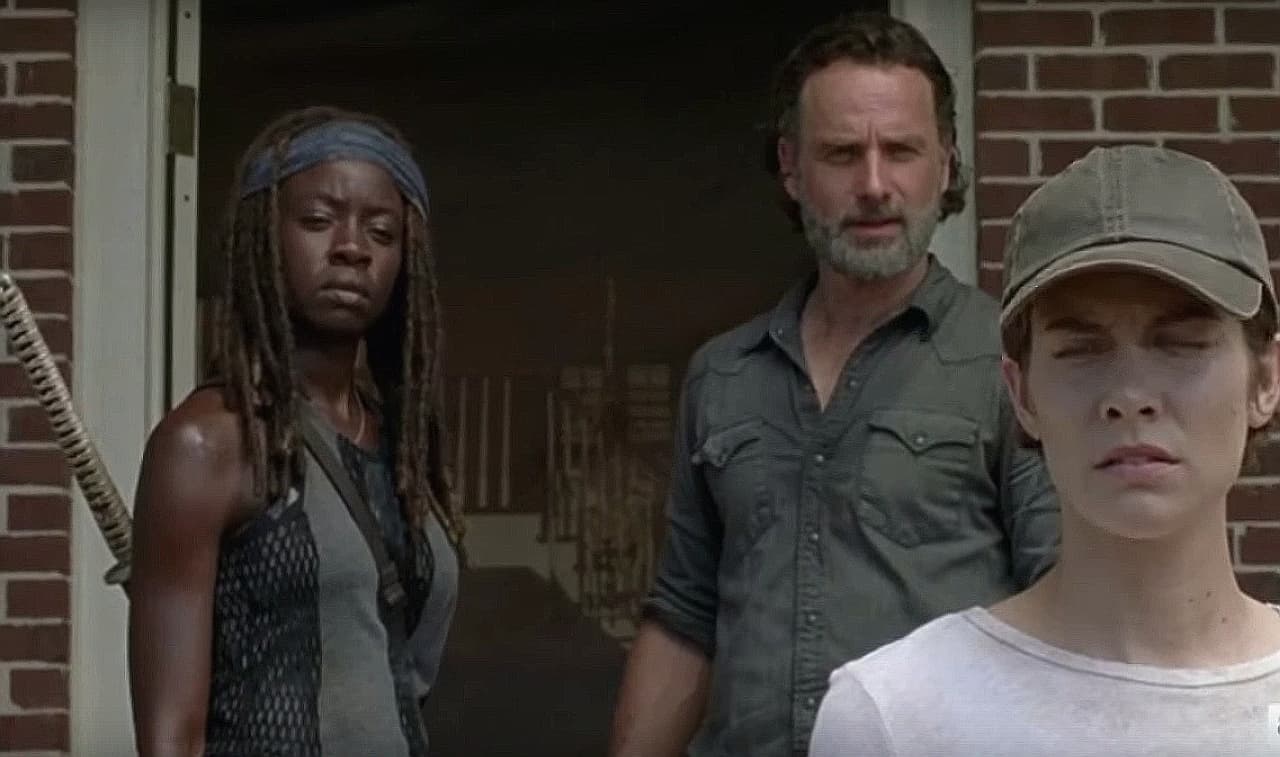 Todo sucede en una de las primeras escenas, cuando el grupo sale de la casa tras hablar con Gregory, y se quedan allí en la puerta conversando con algunos habitantes de Hilltop. ¿Llegaste a observar el fondo? Pues bien, lo que se veía en el interior de la casa no era más que un fondo de papel, bastante evidente, que hizo pensar a todos: ¿será que se les acabó el presupuesto en zombies?