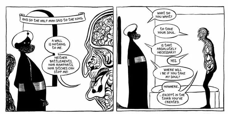 Finalmente, ninguna de las barreras impide que el mensajero llegue por su alma y le dice que va a morir en la tumba que él mismo ha construido, dando el mensaje de que no disfrutó lo que quedaba de su vida.