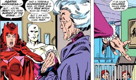En los cómics, Agatha es una poderosa hechicera que se mantiene en un estado moral gris, pues ayuda a diferentes héroes como los 4 Fantásticos con su magia negra.